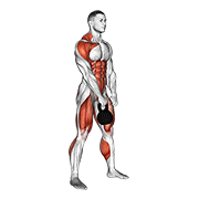 Stand with your feet shoulder-width apart, holding a kettlebell in front of your thighs.