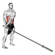 Bend your knees slightly and rotate your torso to the right, swinging the barbell down towards your right hip.